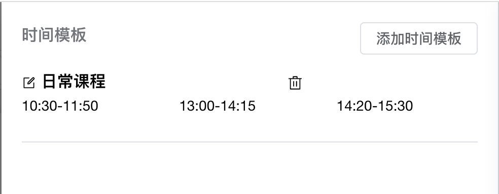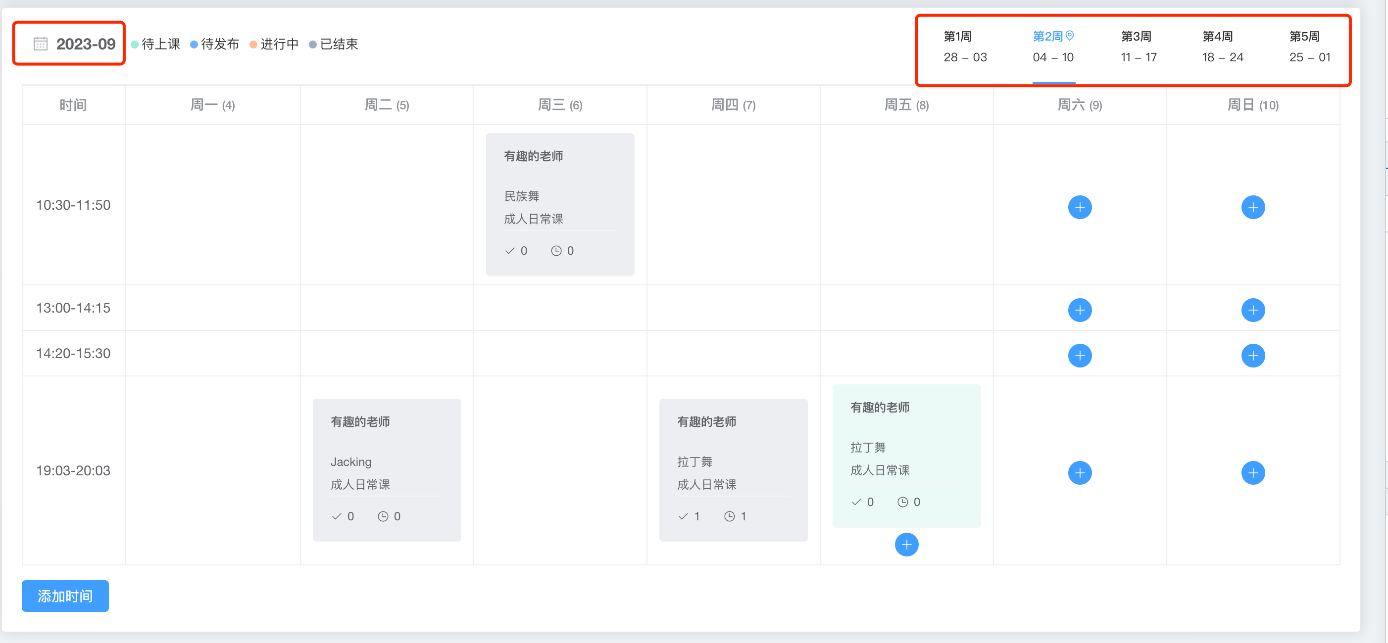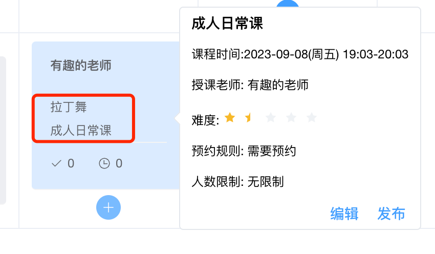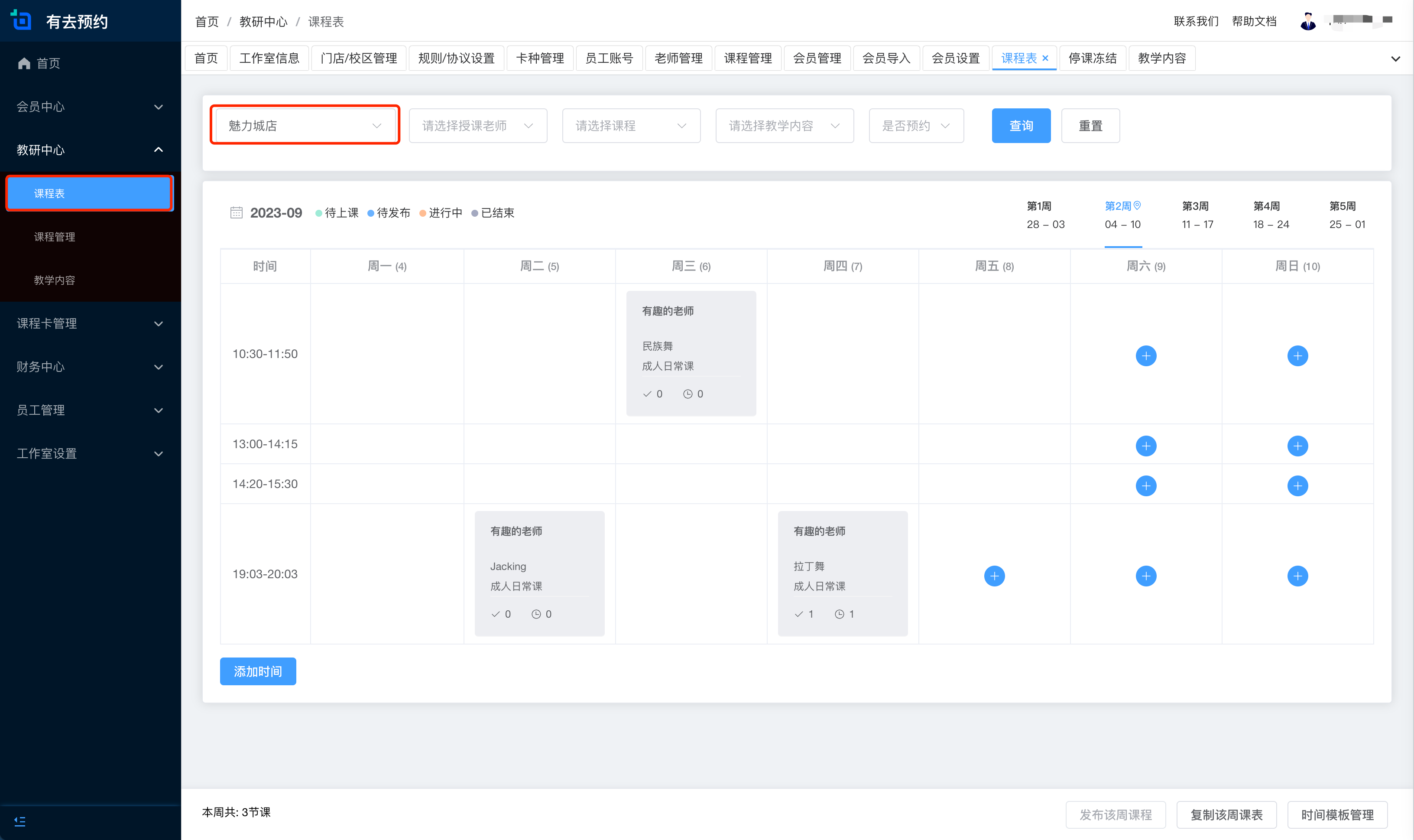 ## 1:功能介绍 工作室创建和发布课程,并管理课程的预约签到操作 ## 2:使用场景 1:工作室排课 2:查看预约和签到信息 3:代会员预约/签到课程 4:复制周课表 ## 3:功能使用 #### 1.使用菜单 教研中心->课程表 内容左上侧红色框中选择对应的门店  #### 2.添加时间/时间模板 在页面的右下角点击时间模板管理,可进入时间模板管理窗口 此窗口可以管理工作室的时间模板 时间模板可用于快速创建排课时间表,可根据工作室运营情况制作好时间模板,后面再排课时即可快速创建排课  在课表的左下方 “添加时间” 按钮可以创建选择门店在指定周的排课时间, 选择好开始和结束时间确定后,课表上则会多一栏对应的时间,点击课表上的加号即可开始创建排课  #### 3.创建排课 点击课表时间栏里面对应的蓝色加号,即可进入排课窗口 注:==如果时间栏的时间已经小于当前时间,则不会显示加号==   ==授课课程==: 课程管理里对应的课程,不同的课程可使用不同的课程卡 ==授课老师==: 通过老师管理添加的老师,最多只能添加3位 ==教学内容==: 教学内容管理对应的教学内容 ==课程难度==: 根据实际情况填写,可供会员在小程序段预约查看时提供选择 ==扣除次数==: 上本次课程需要使用扣除多少次课程卡.(PS:期限卡不限制) ==课程费用==: 使用会员余额,或购买单课是的价格。会自动使用课程管理里设置的费用,可自行更改。 ==是否需要预约==: 如果不需要预约,则直接到门店签到上课即可。如果需要预约,则需会员到小程序 先进行预约才能进行签到上课 ==能否取消预约==: 选择否后,预约的会员将不能自行取消预约.(只能通过后台管理员进行取消) ==预约支付方式==: 本课程预约时可使用的方式 ==人数限制==: 本课程是否限制上课人数,如果人数超过限制,会员将不能预约 ==更多设置==: 更多设置里的内容均和教研配置相同 如不进行设置,则会默认使用校验配置的内容 注:==在课程发布时生效,如课程在创建时校验配置开启了人数不足自动取消,但是在发布前又重新修改为关闭,然后再发布本堂课程,那么该课程的人数不足自动取消则为关闭状态。如果在课程发布后修改教研配置,那么修改本课程不受影响。== #### 4.课程发布 课程分为 ==待发布,待上课,进行中==,已结束 4个状态,对应4中不同的颜色 待发布的课程表表示课程未正式上线,不会显示在小程序中,也不能进行预约/签到操作 将鼠标移入对应课程的 课程类型和授课内容处停留大概2秒,则会显示出发布课程按钮 点击发布,完成对本课程的发布 也可以点击页面下方的发布本周课程,将本周所有的课程进行发布   #### 5.查看课程预约/签到信息 将鼠标移入课程签到/预约数量地方会显示出本课程的预约/签到人数 点击后会进入 预约/签到的会员列表,同时可以在弹出页面中完成代预约,代签到的功能  #### 6.课表默认时间 课表按照周来显示课程 课表默认会显示当前时间所在的周 可以点击上方周部分,进行周的切换  也可以点击日期部分,选择切换月查看以往课程