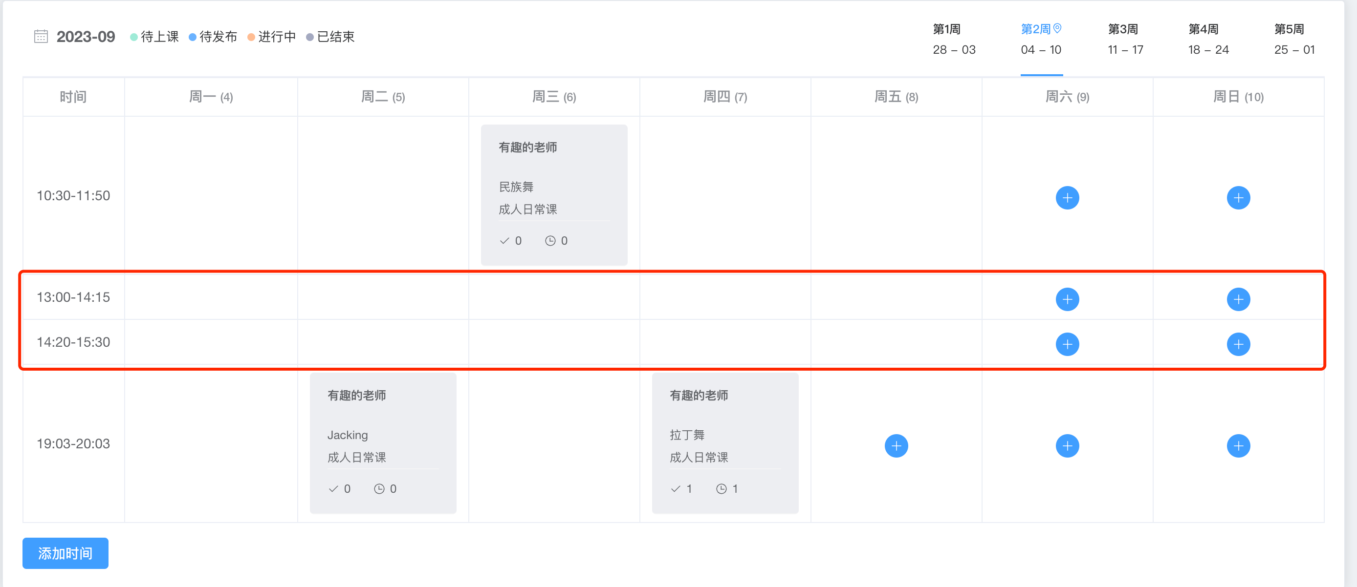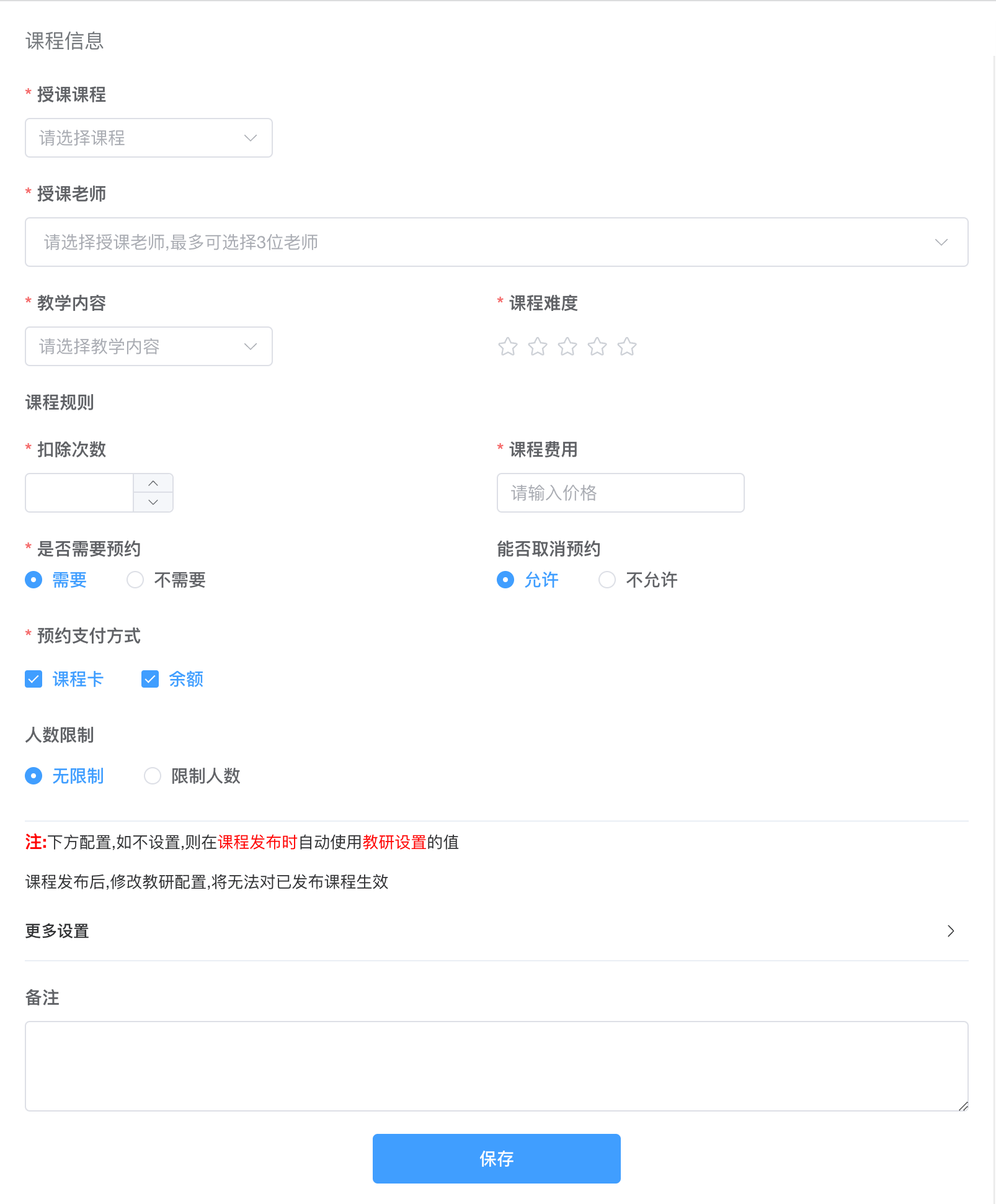 ## 1:功能介绍 工作室创建和发布课程,并管理课程的预约签到操作 ## 2:使用场景 1:工作室排课 2:查看预约和签到信息 3:代会员预约/签到课程 4:复制周课表 ## 3:功能使用 #### 1.使用菜单 教研中心->课程表 内容左上侧红色框中选择对应的门店  #### 2.添加时间/时间模板 在页面的右下角点击时间模板管理,可进入时间模板管理窗口 此窗口可以管理工作室的时间模板 时间模板可用于快速创建排课时间表,可根据工作室运营情况制作好时间模板,后面再排课时即可快速创建排课  在课表的左下方 “添加时间” 按钮可以创建选择门店在指定周的排课时间, 选择好开始和结束时间确定后,课表上则会多一栏对应的时间,点击课表上的加号即可开始创建排课  #### 3.创建排课 点击课表时间栏里面对应的蓝色加号,即可进入排课窗口 注:==如果时间栏的时间已经小于当前时间,则不会显示加号==   ==授课课程==: 课程管理里对应的课程,不同的课程可使用不同的课程卡 ==授课老师==: 通过老师管理添加的老师,最多只能添加3位 ==教学内容==: 教学内容管理对应的教学内容 ==课程难度==: 根据实际情况填写,可供会员在小程序段预约查看时提供选择 ==扣除次数==: 上本次课程需要使用扣除多少次课程卡.(PS:期限卡不限制) ==课程费用==: 使用会员余额,或购买单课是的价格。会自动使用课程管理里设置的费用,可自行更改。 ==是否需要预约==: 如果不需要预约,则直接到门店签到上课即可。如果需要预约,则需会员到小程序 先进行预约才能进行签到上课 ==能否取消预约==: 选择否后,预约的会员将不能自行取消预约.(只能通过后台管理员进行取消) ==预约支付方式==: 本课程预约时可使用的方式 ==人数限制==: 本课程是否限制上课人数,如果人数超过限制,会员将不能预约 ==更多设置==: 更多设置里的内容均和教研配置相同 如不进行设置,则会默认使用校验配置的内容 注:==在课程发布时生效,如课程在创建时校验配置开启了人数不足自动取消,但是在发布前又重新修改为关闭,然后再发布本堂课程,那么该课程的人数不足自动取消则为关闭状态。如果在课程发布后修改教研配置,那么修改本课程不受影响。== #### 4.课程发布 课程分为 ==待发布,待上课,进行中==,已结束 4个状态,对应4中不同的颜色 待发布的课程表表示课程未正式上线,不会显示在小程序中,也不能进行预约/签到操作 将鼠标移入对应课程的 课程类型和授课内容处停留大概2秒,则会显示出发布课程按钮 点击发布,完成对本课程的发布 也可以点击页面下方的发布本周课程,将本周所有的课程进行发布   #### 5.查看课程预约/签到信息 将鼠标移入课程签到/预约数量地方会显示出本课程的预约/签到人数 点击后会进入 预约/签到的会员列表,同时可以在弹出页面中完成代预约,代签到的功能  #### 6.课表默认时间 课表按照周来显示课程 课表默认会显示当前时间所在的周 可以点击上方周部分,进行周的切换  也可以点击日期部分,选择切换月查看以往课程